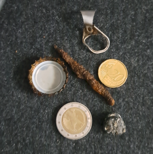 A lot of initial setup has happened between me buying the detector and starting to write on this blog, and I have already been out detecting three times now, each time just with the goal of finding a single bottle cap, and familiarizing myself with detecting, digging, and developing an ear for the different tones again. So far, I have found two coins, 8 bottle caps, 3 pull tabs and several iron nails, undefinable aluminum blobs, and four holes where I couldn't find anything, I believe they were hallucinations of the big coil that the detector came with.